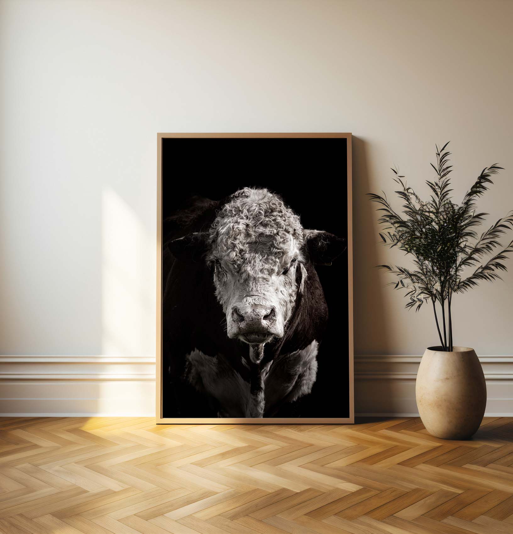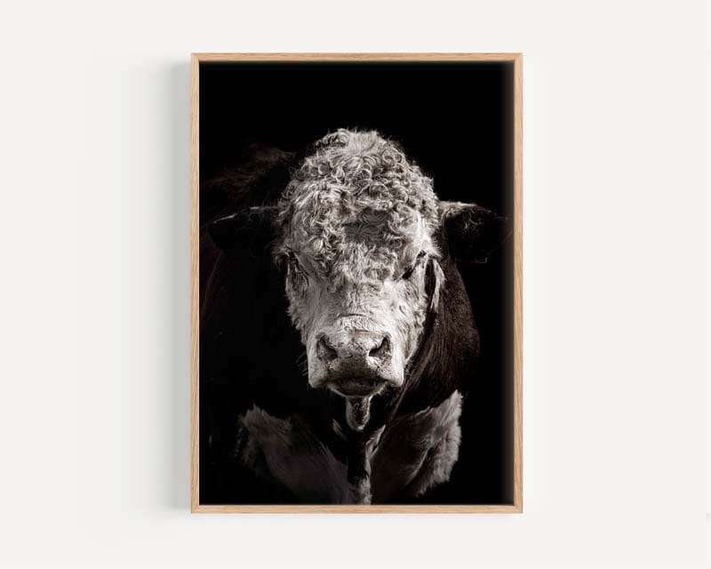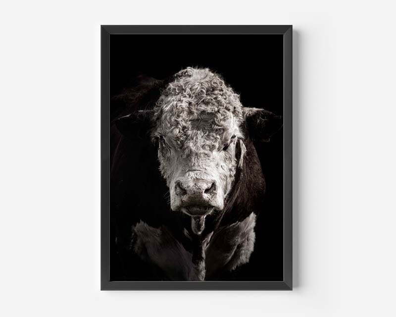 Ronald is a captivating fine art print of a Hereford bull set against a dramatic black backdrop. The rich textures of his coat stand out beautifully against the darkness, showcasing the intricate details that make this piece truly special.